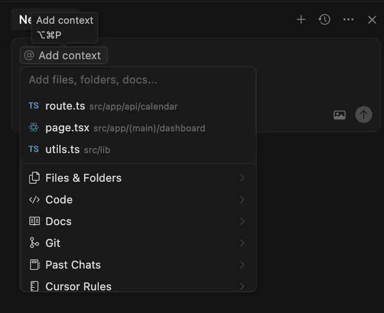 The @ symbol: Click the @ symbol or type it in to chat to see what files Cursor suggests. This tells the AI “pay attention to this specific file.”