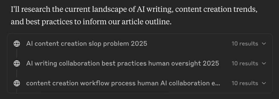 The AI comes back with a comprehensive overview that would have taken me hours to compile. Sometimes it surfaces angles I hadn’t considered. Sometimes it finds data that strengthens my argument. Sometimes it reveals that my hot take has already been thoroughly explored, saving me from publishing something redundant.