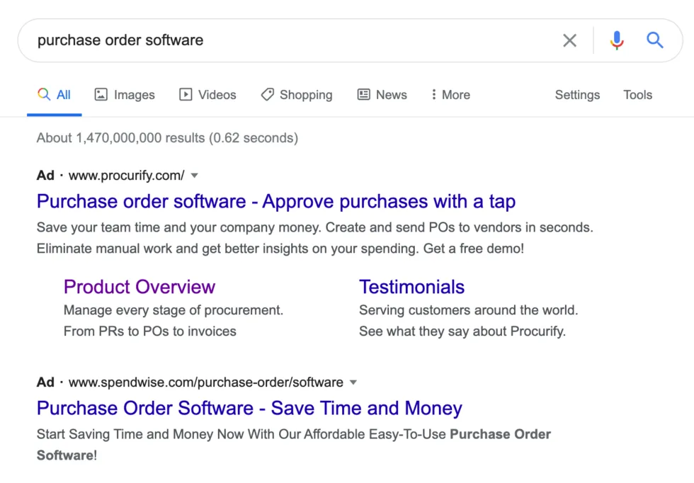 This is to say they solve many problems. So while they brand themselves as a “spend management” software, I also figured that anyone looking for, say, software to manage purchase orders would be qualified. So each solution Procurify offered had its own campaign.